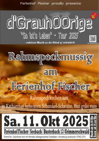 Was wäre eine Saison ohne ein musikalisches Stelldichein bei Fischers im Busterbach! Kurzfristig und ohne grosses Tamtam wird derselbe zum Tatort erkoren in der Hoffnung, dass die jetzt schon zahlreich angemeldeten Gäste sich ebenso freuen wie wir. Ganz nebenbei spuckt dann noch Wendels mächtiger Rahmspeckofen ab 19.oo Uhr seine kulinarischen Köstlichkeiten in die Scheune. Vielleicht ist noch ein Plätzchen frei, der Eintritt ist's auf jeden Fall. Ein kleiner Hut wird die Runde machen. Anmeldungen unter 07842 2751